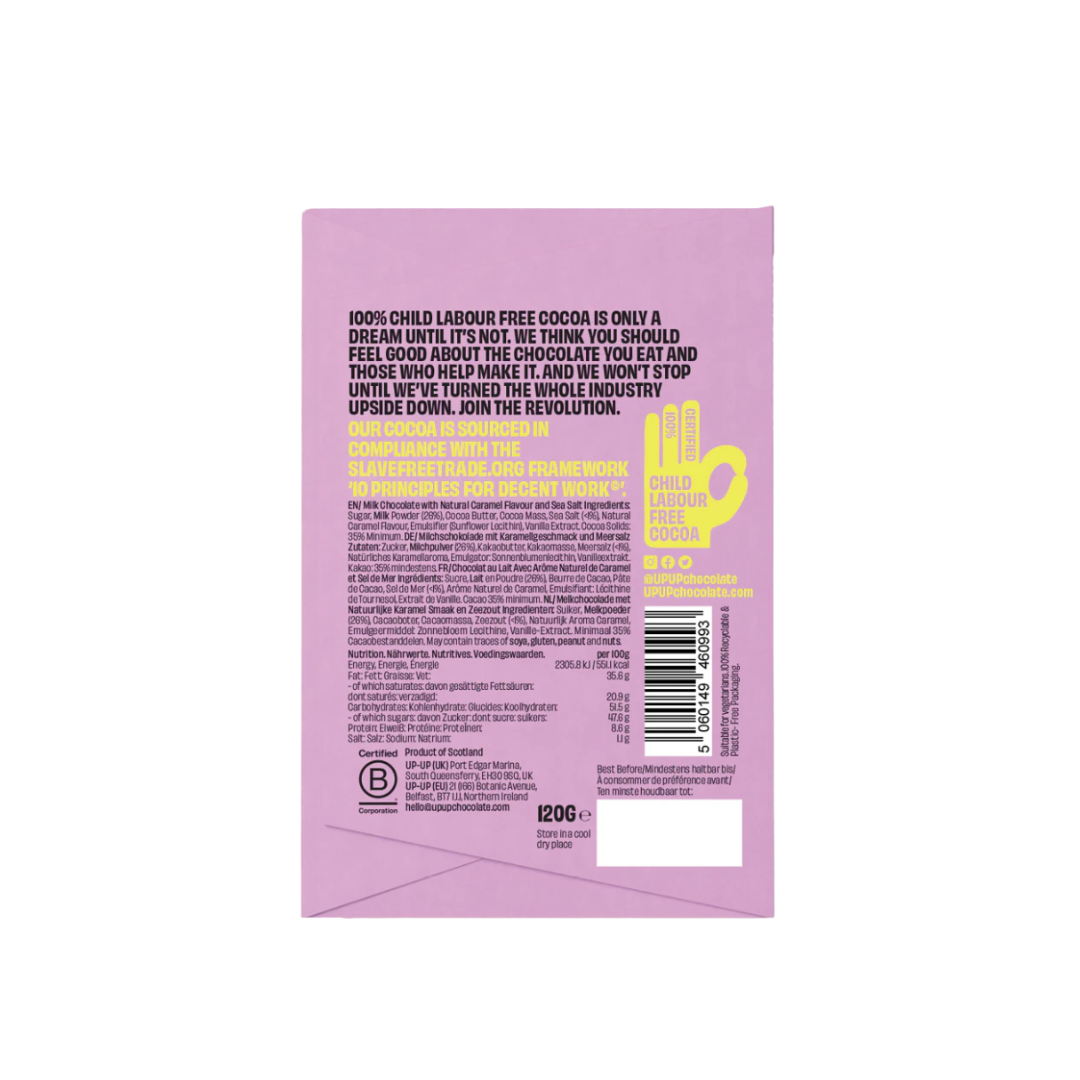 UP-UP Chocolate Salted Caramel is a milk chocolate bar made with fine flavour cocoa beans from a single farm called "El Rosario" located in the Necocli region on the north-eastern coast of Colombia. This chocolate bar features a delicate blend of flavours and inclusions, this chocolate bar brings to the front-line well-defined caramel notes with noticeable tones of sea salt and a smooth milky mouthfeel. Cacao sourced from cocoa farm that is 100% certifed by SLAVEFREETRADE.ORG.